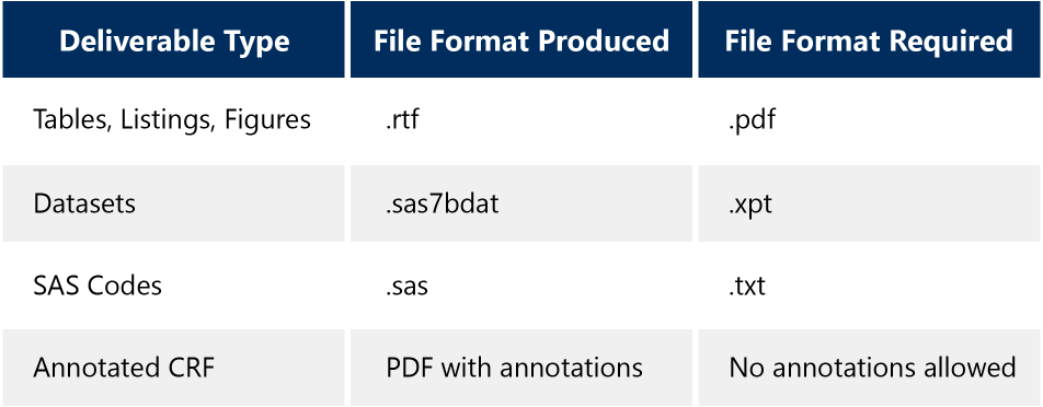 - Data package conversion: Clinical programming and statistics deliverables may be presented in unacceptable file formats for the eCTD (correct file formats can be viewed in the chart below)